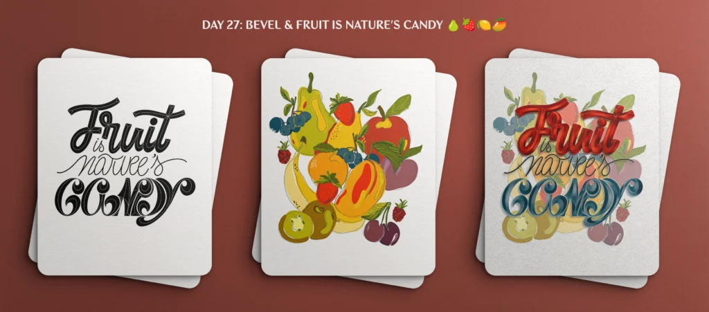 For this year’s challenge, I chose a theme centered around fruit. My goal was to create entries so tempting that people would rush to the store to buy them. To achieve this, I designed a large, vibrant logo featuring the first letter of each fruit’s name to grab attention, along with the fruit’s name and an accompanying illustration.